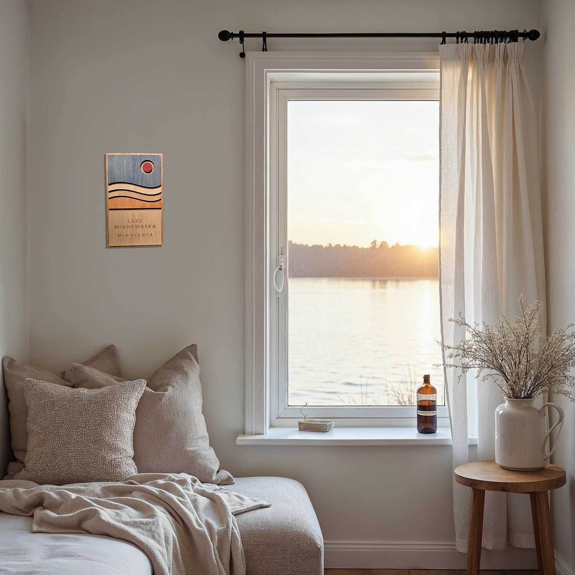 Capture the serene beauty of Lake Minnewaska with this handcrafted vintage wooden sign. Using rich stains to bring out the natural wood grain, this piece features a stylized depiction of the lake under a setting sun. Crafted from solid hard maple sourced in the USA, and backed with durable oak, this sign offers a unique blend of rustic charm and lasting quality. Measuring 6 inches wide and 10 inches tall, it's the perfect size to add a touch of Minnesota nostalgia to any room.