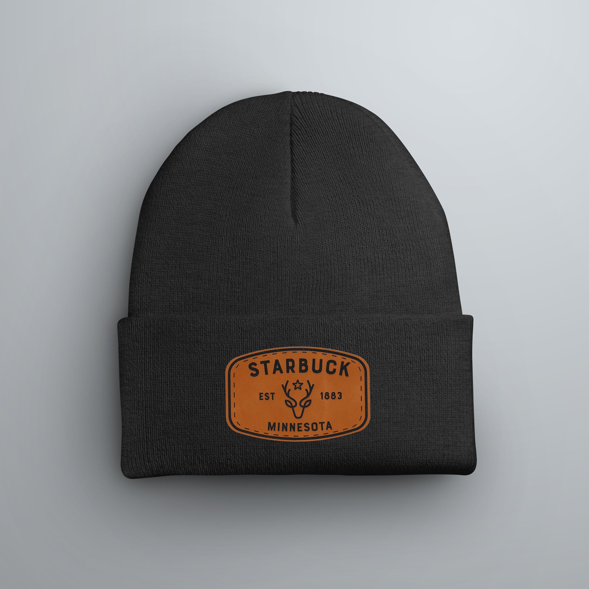 Represent Starbuck, Minnesota with this classic, high-quality winter beanie. This hat features an exclusive Starbuck Icon patch displaying the town name, establishment date (1883), and a distinctive deer/buck silhouette on a rustic leatherette background.